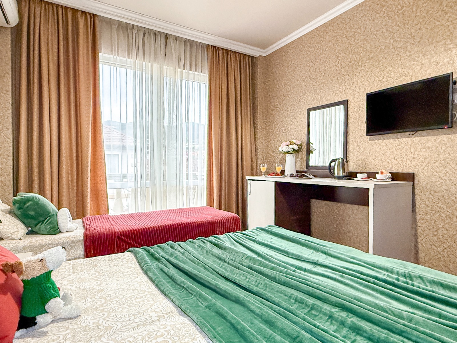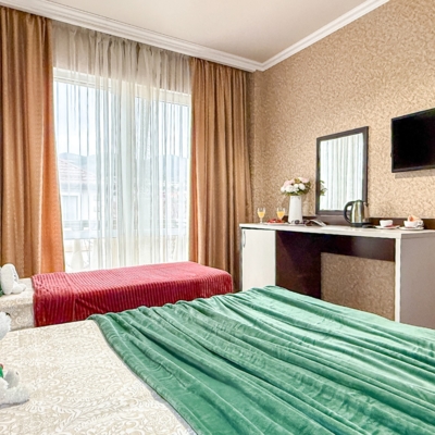 • При бронировании трёхместного номера, предоставляется размещение категории TWIN+ EXB ( стандартный номер с двумя раздельными кроватями + дополнительное спальное место( возможно раскладушка))